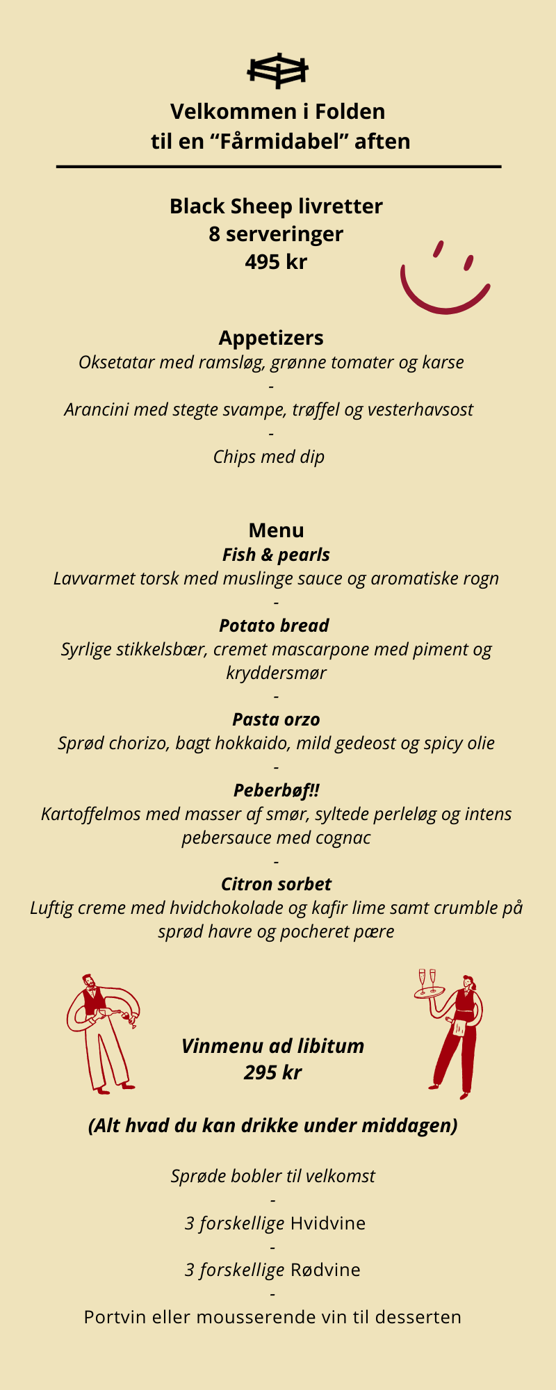 Som noget helt nyt, kan du nyde vin ad libitum (kun under middagen), hvor vi har fået vores sommeliere til at udvælge en skøn række vine fra sprøde bobler, friske hvide, til både bløde og tunge røde, samt afslutningsvis portvin eller mousserende til desserten.